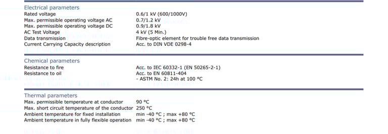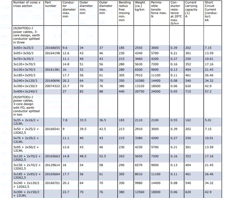 3-Core Design with Fiber Optics: Configurations such as 3x50+2x25/2+12G62,5, integrating 12 fiber optic elements for data transmission.
