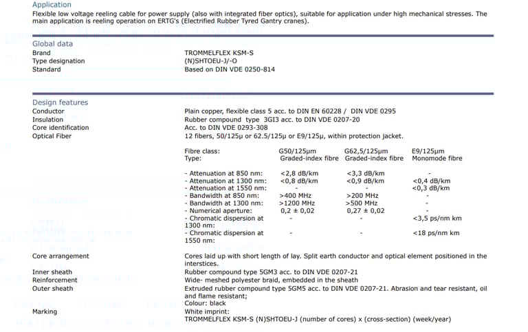 The TROMMELFLEX (KSM-S) (N)SHTOEU is a low voltage reeling cable engineered for applications under high mechanical stress, such as E-RTG cranes. Unlike standard cables, it combines robust power transmission with integrated fiber optic capabilities, enabling simultaneous energy delivery and high-speed data communication. This dual functionality makes it ideal for modern industrial systems where efficiency and connectivity are critical. Based on the DIN VDE 0250-814 standard, the cable is designed to meet the rigorous demands of continuous reeling operations, offering unmatched durability, flexibility, and resistance to environmental challenges.