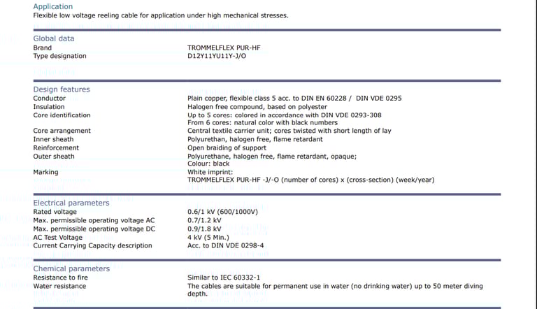 Cables are the unsung heroes of industrial operations, transmitting power and signals while enduring constant motion, torsion, and environmental assaults. Low voltage reeling cables, like the TROMMELFLEX PUR-HF D12Y11YU11Y, are specialized for applications involving spools or reels, such as cranes, hoists, and conveyor systems in mining. The "reeling" aspect refers to their ability to wind and unwind repeatedly without failing, crucial in dynamic setups.