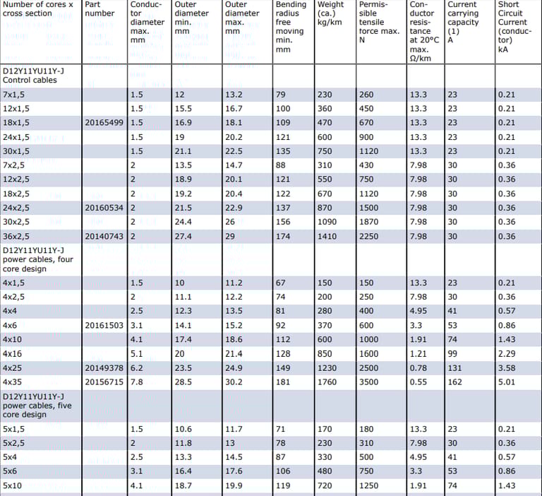 Control Cables: These handle signal transmission for automation. Examples include 7x1.5 mm² up to 36x2.5 mm² variants, ideal for precise control in machinery. They feature multiple cores (up to 36) twisted around a central textile carrier for enhanced flexibility.