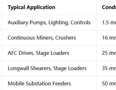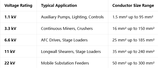 1.1 kV – Suitable for face conveyors, panel pumps, and auxiliary equipment.