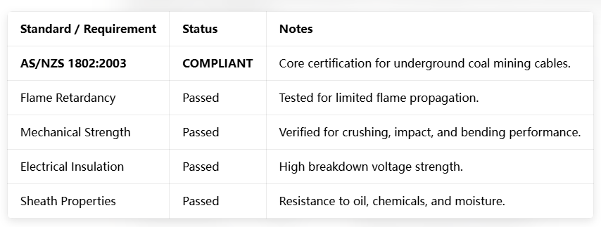 In the world of underground mining, certification is not just a paperwork requirement; it is a guarantee of safety and performance. The AS/NZS 1802 standard is widely recognized as one of the most rigorous specifications for electrical cables used in underground coal mines. It sets out requirements for construction, testing, and performance to ensure that cables can withstand fire, mechanical damage, and electrical stress without failing.