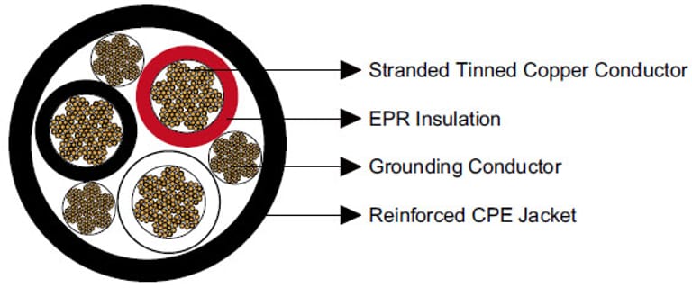 Jacket | Reinforced heavy-duty/extra-heavy-duty Chlorinated Polyethylene (CPE), black. (Cables having a nominal outside diameter of more than 2.0 inches require extra-heavy-duty jackets.) |