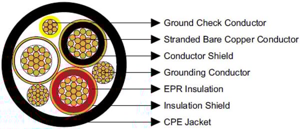 Type MP-GC Three-Conductor Mine Power Feeder Cable, CPE Jacket, 8kV to ICEA S-75-381