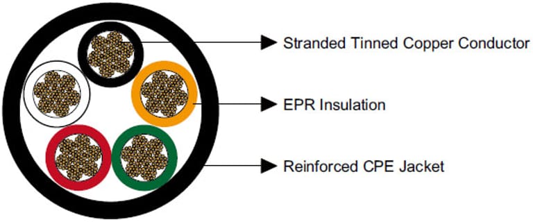 Sheath | Reinforced heavy-duty/extra-heavy-duty Chlorinated Polyethylene (CPE), black. (Cables having a nominal outside diameter of more than 2.0 inches require extra-heavy-duty jackets.) |