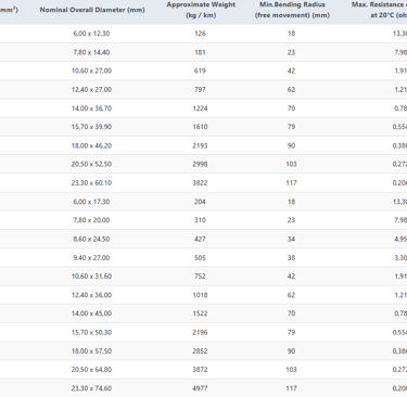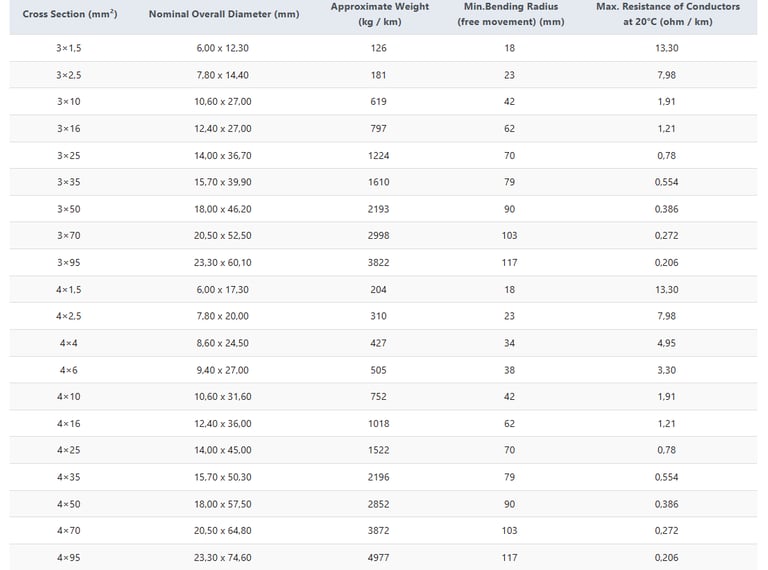 Dimensions, weights, bending radii, and conductor resistance values are carefully engineered to meet system design requirements and energy efficiency expectations.