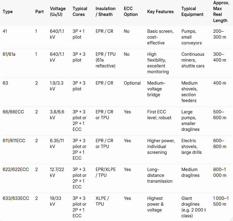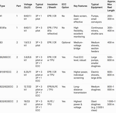 Selection Logic Choose Part 1 for equipment under 3.3 kV and short runs. Move to Part 2 when power demand exceeds 1 MW or distance exceeds 400 m. Always specify ECC on voltages above 6.6 kV. TPU sheaths (especially 61a) are preferred in wet underground conditions; CR remains the heavy-duty standard for opencast UV and abrasion.