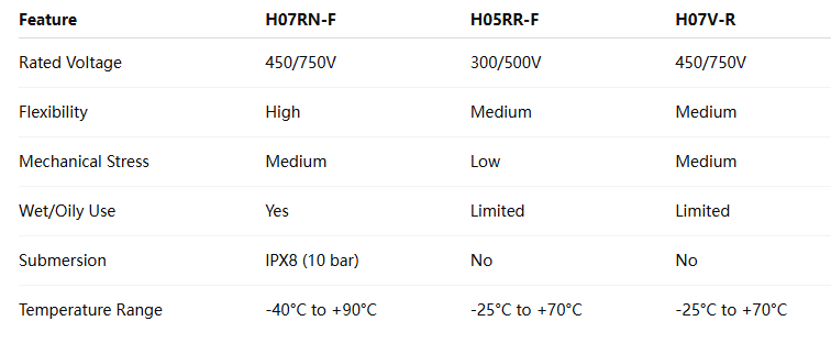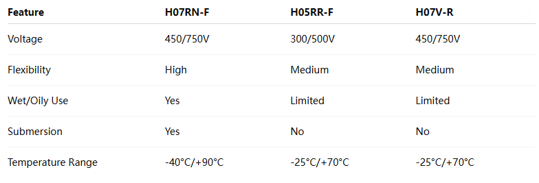 H07RN-F stands out due to its combination of flexibility, voltage rating, and environmental resistance. Here’s a direct comparison with commonly used alternatives: