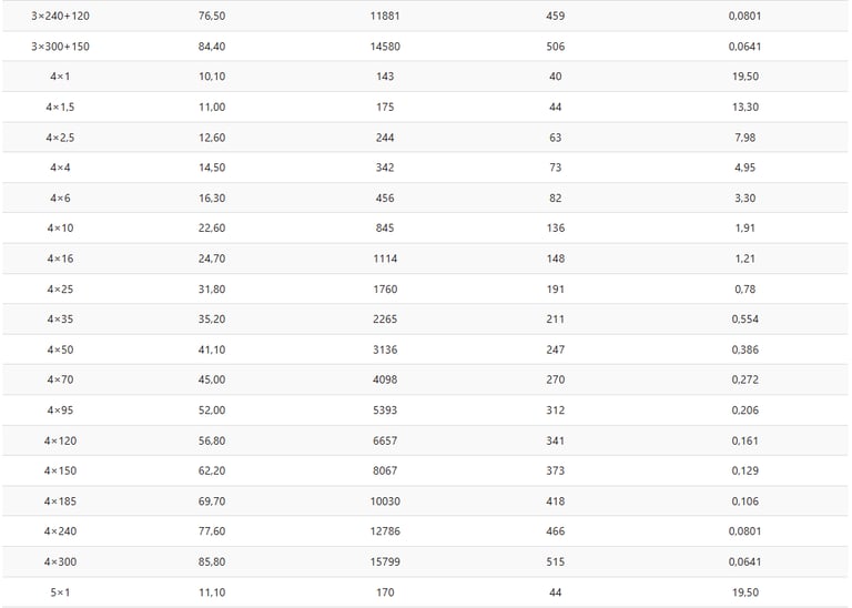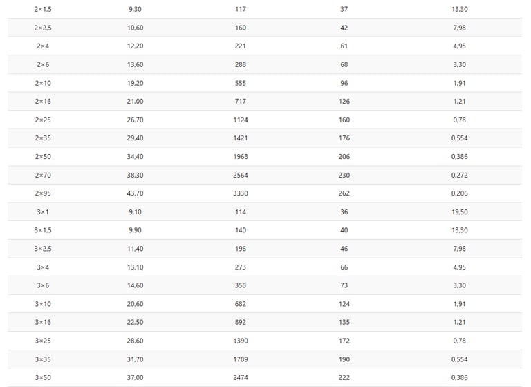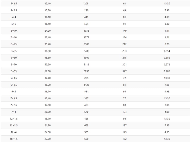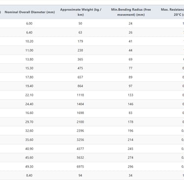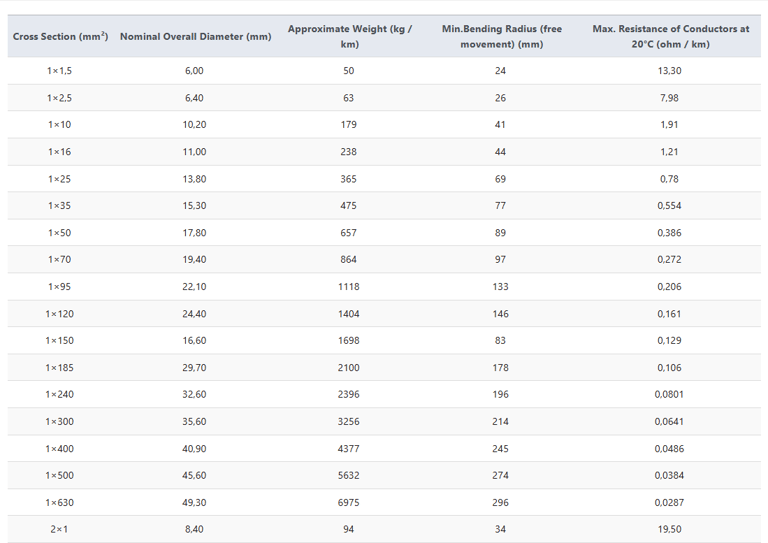 This table helps engineers select the correct cable for specific load and installation requirements.