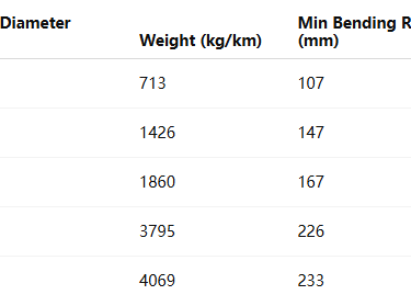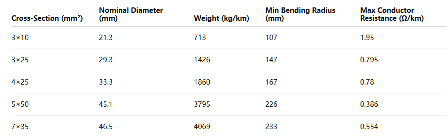 Minimum bending radius: Defined according to VDE 0298-3. For example, a 4×25 mm² NSHTÖU cable has a minimum free-movement bending radius of 167 mm.