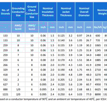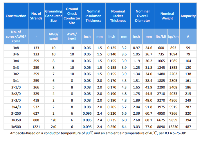 Note: Ampacity is based on a conductor temperature of 90°C and an ambient temperature of 40°C, following ICEA S-75-381 standards.