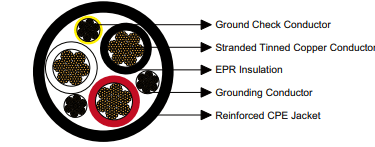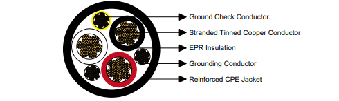 Key advantages include tinned copper conductors, EPR insulation, reinforced CPE jackets, and ground check conductors.