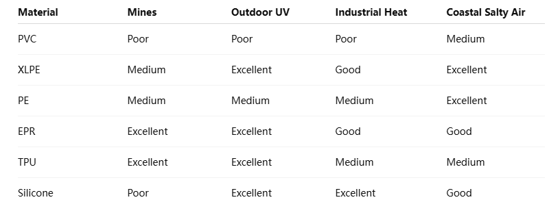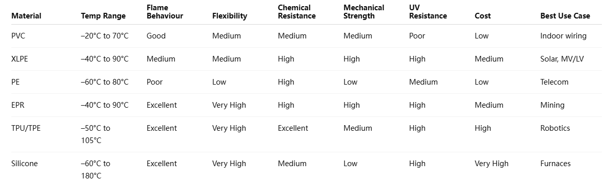 PVC, XLPE, PE, EPR, TPU, and Silicone each offer unique strengths and weaknesses. Understanding these allows engineers and buyers to make informed, cost-effective, and safety-oriented choices.
