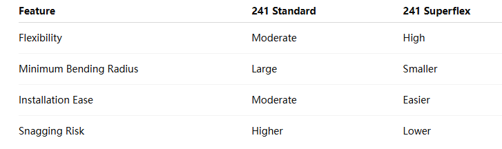 This comparison highlights how 241.6 is designed for higher mechanical and electrical stresses, whereas 241.1 emphasizes ease of installation in tighter loops.