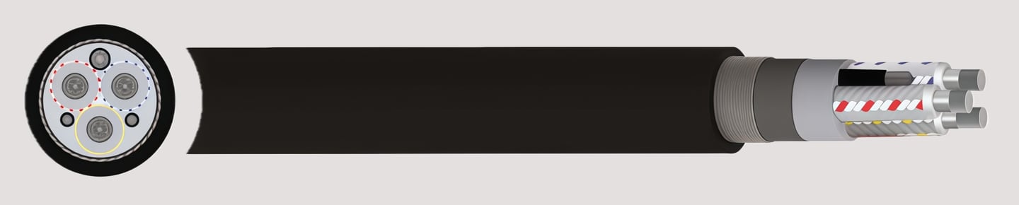 Three screened power cores + three pilot cores (or 2 pilots + ECC) are laid up together