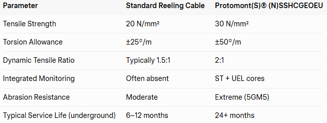 Protomont(S)® (N)SSHCGEOEU was developed under VDE 0250-812 specifically for underground reeling applications involving simultaneous tensile and torsional loads under dynamic, non-linear conditions. Its design rejects the assumption of predictable motion and instead treats the cable as a mechanical system operating in chaotic three-dimensional space.