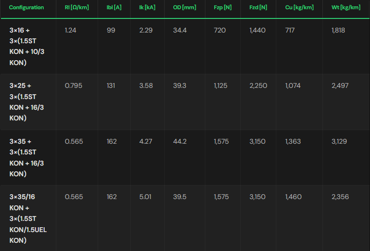 Integrated 1.5 mm² ST control cores (for reel speed/tension and emergency stop) and 1.5 mm² UEL earth-leakage monitoring cores. Split concentric KON earth conductors provide the shortest possible fault-current path, fully compliant with MHSA requirements for real-time insulation monitoring (alarm at <50 kΩ, trip at <10 kΩ).