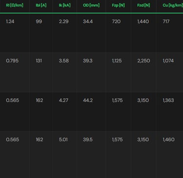 Rated voltage 0.6/1 kV, test voltage 3 kV. Configurations support currents from 99 A (3×16 mm²) to 162 A (3×35 mm²) at typical underground duty cycles.