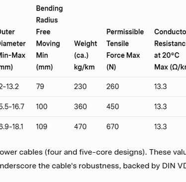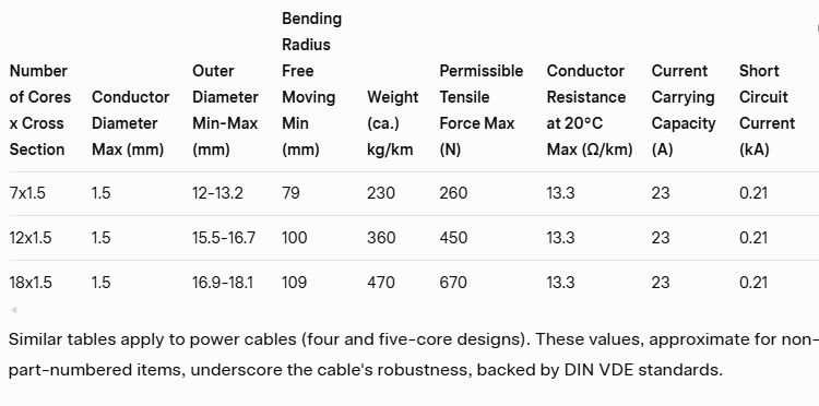 Similar tables apply to power cables (four and five-core designs). These values, approximate for non-part-numbered items, underscore the cable's robustness, backed by DIN VDE standards.